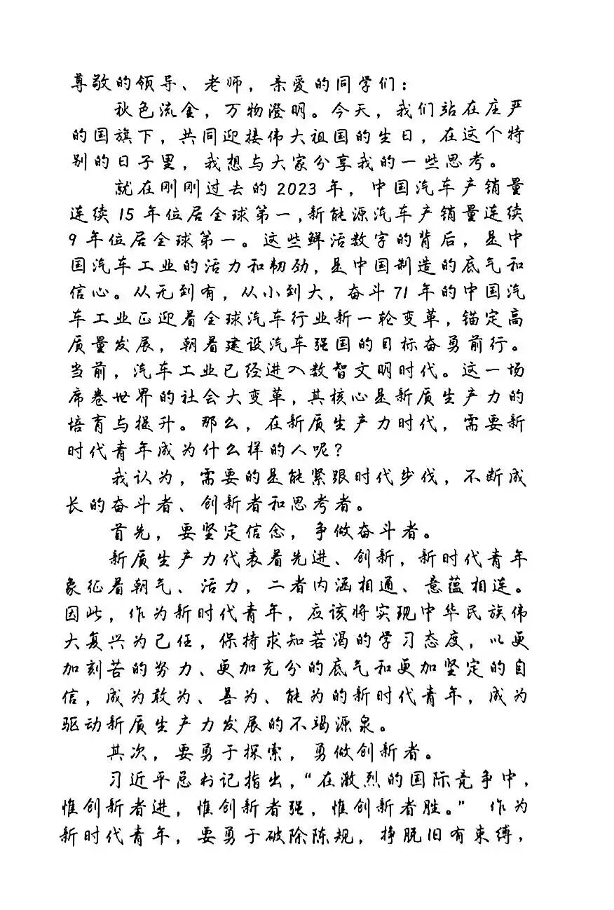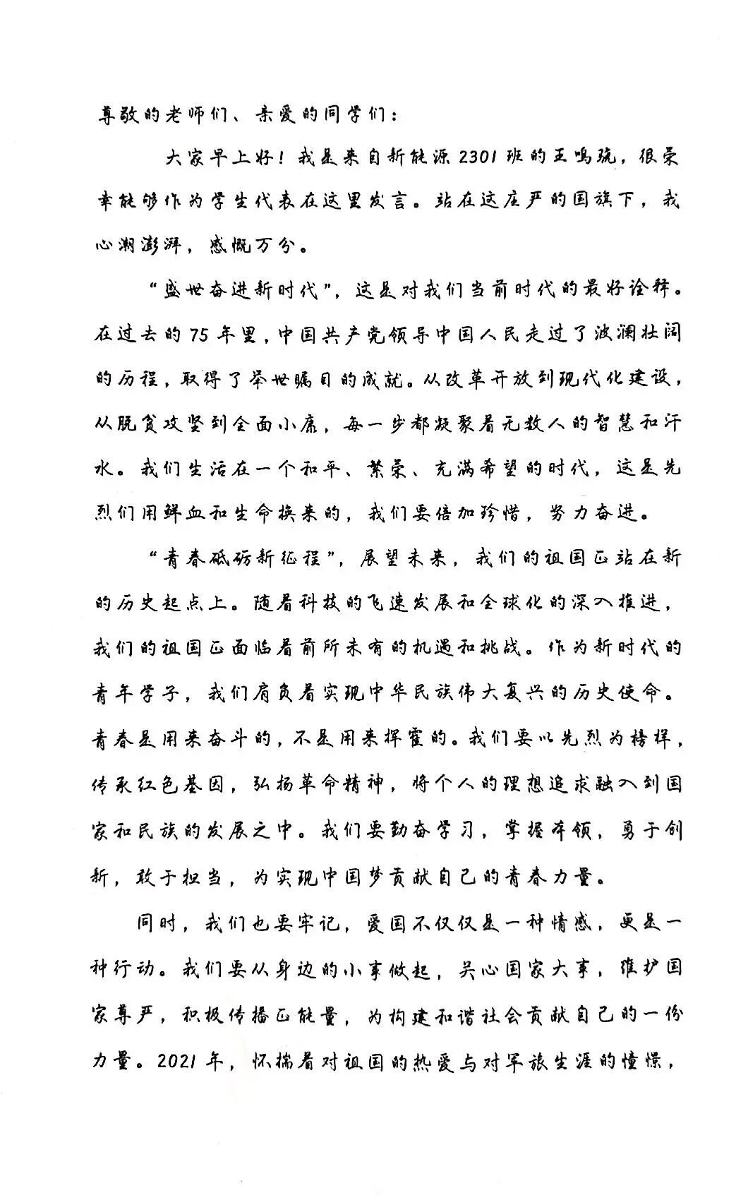 汽车技术与服务学院学生代表王鸣骁同学结合自身军旅生涯的宝贵经历,深情讲述了革命先烈的英勇事迹和无私奉献精神。他说这身军装不仅仅是一种荣誉,更是一种责任和使命。它承载着祖国的期望和人民的信任,让他时刻牢记自己的初心和使命。并表示虽然已经离开了军营,但军人身份永远不会改变。他会继续将这份精神融入到学习和生活中,继续发扬军人的优良传统和作风。无论走到哪里、无论身处何境,都会牢记祖国的期望和人民的信任。以更加饱满的热情、坚定的信念投入到学习和生活中。