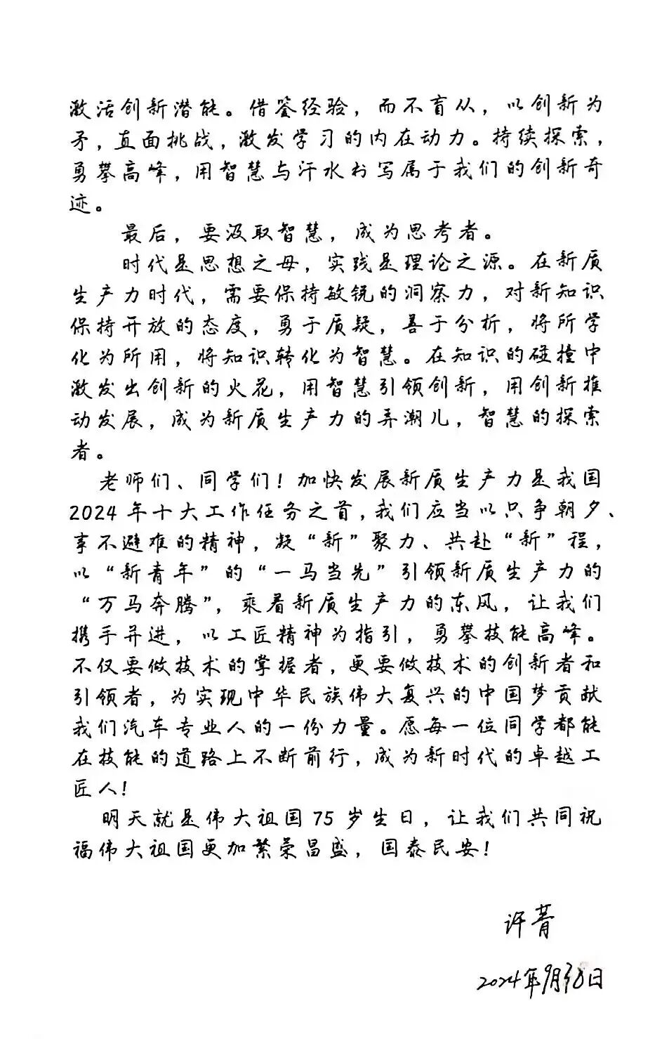 汽车技术与服务学院教师代表许菁老师勉励同学们要继承和发扬革命传统,缅怀先烈,他们的牺牲和奉献为我们的幸福生活奠定了基础,作为汽车技术与服务学院的学生,更要关注汽车行业前沿领域,秉持工匠精神,怀揣着对技术极致追求的匠心,以精益求精的态度、勇于创新的精神,满怀激情地投身其中,将个人的智慧与汗水融入到新能源汽车的每个细节中,推动这一绿色产业蓬勃发展。如此,方能不负先烈遗志,不负时代重托,以实际行动为中华民族伟大复兴的中国梦注入源源不断的青春活力与技术动能。