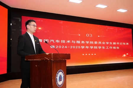 张涛同学代表第十三届团委、学生会作做2024-2025学年汽车技术与服务学院团委、学生会工作汇报。他条分缕析地回顾了过去一年里,组织部、办公室、宣传部、社会实践部、外联文体部、寝管生活部以及纪检部等七大部门,在思想引领、组织建设、校园文化营造、志愿服务开展、学风氛围塑造、生活服务保障等多方面所付出的不懈努力与所取得的显著成果,全面展示了我院团学组织的活力与担当。